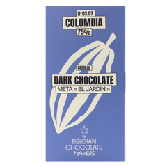 Le chocolat noir Colombia Meta El Jardín 75%, une tablette exclusive d'origine unique fabriquée à la main à Bruxelles. Cacao Criollo rare offrant une élégance fruitée raffinée et un terroir exceptionnel.