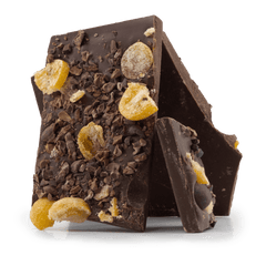 Ingredients: Pâte de cacao, sucre, beurre de cacao, kumquat confit, pépites de cacao, lécithine de tournesol.