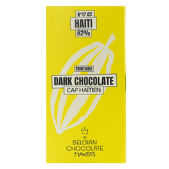 Haïti Cap Haïtien 62% de chocolat noir, fabriqué artisanalement à Bruxelles à partir de cacao d'origine unique. Une tablette onctueuse aux notes fruitées subtiles et au caractère authentique.