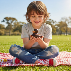 Délicieux canard au chocolat au lait artisanal de 150 g, fabriqué avec du cacao haïtien de qualité et soigneusement élaboré à Bruxelles, un régal festif onctueux et crémeux