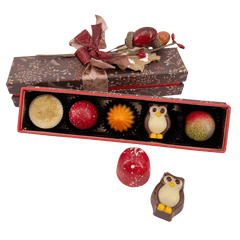 Ingredients: Sugar, cocoa butter, cocoa mass, milk powder, hazelnut, almond, cream, pomegranate purée, glucose syrup, sorbitol, butter, coffee, fruit juice and pulp (blueberry, blackcurrant, redcurrant), panela, pumpkin spice (cinnamon, nutmeg, cloves, ginger, chili, cardamom), sunflower lecithin, Bourbon vanilla from Madagascar.