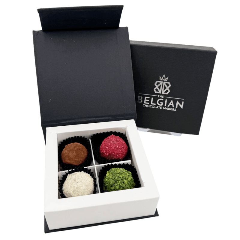 Indulge in our box of 4 Belgian chocolate truffles in mixed flavours, crafted in Brussels with ethical cacao. A refined gift or gourmet delight to share.