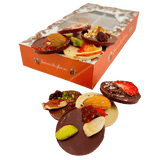 Enjoy our box of 24 Belgian chocolate mendiants, handcrafted in Brussels with ethical cacao and gourmet toppings. A refined gift or indulgent treat.