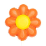 Artisanal chocolate lollipop shaped as a orange flower with white chocolate accents, a charming gourmet treat and a thoughtful gift for chocolate lovers
