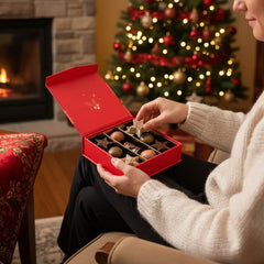 Share the joy of Christmas with our Ho-Ho-Ho chocolate box, filled with 9 handcrafted Belgian pralines (135g). A festive assortment made with ethical cacao and artisanal passion in Brussels.