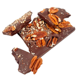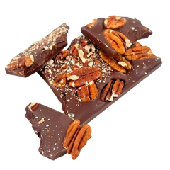 Handcrafted dark chocolate broken bars with pecan. Made with premium cocoa from the Philippines, offering a rich, fruity, and nutty gourmet experience.