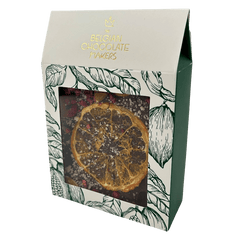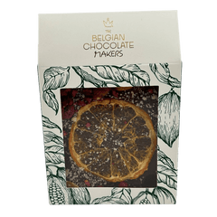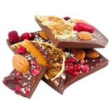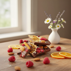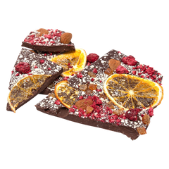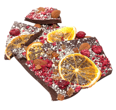 Handcrafted dark chocolate broken bars with raspberry, almond, and orange. Made with premium cocoa from the Philippines, offering a rich, fruity, and nutty gourmet experience.