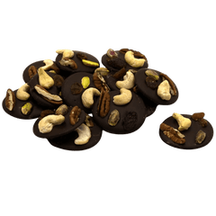 Delicious 150g dark chocolate mendiants topped with cashew, pistachio, raisin and pecan chunks, a perfect blend of rich cocoa and crunchy goodness.