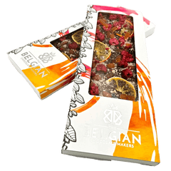 Savor our Fantasy dark chocolate bar 550g, crafted with tangy raspberry, zesty orange and crunchy almond chunks. A gourmet oversized Belgian delight, perfect for gifting or sharing.