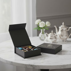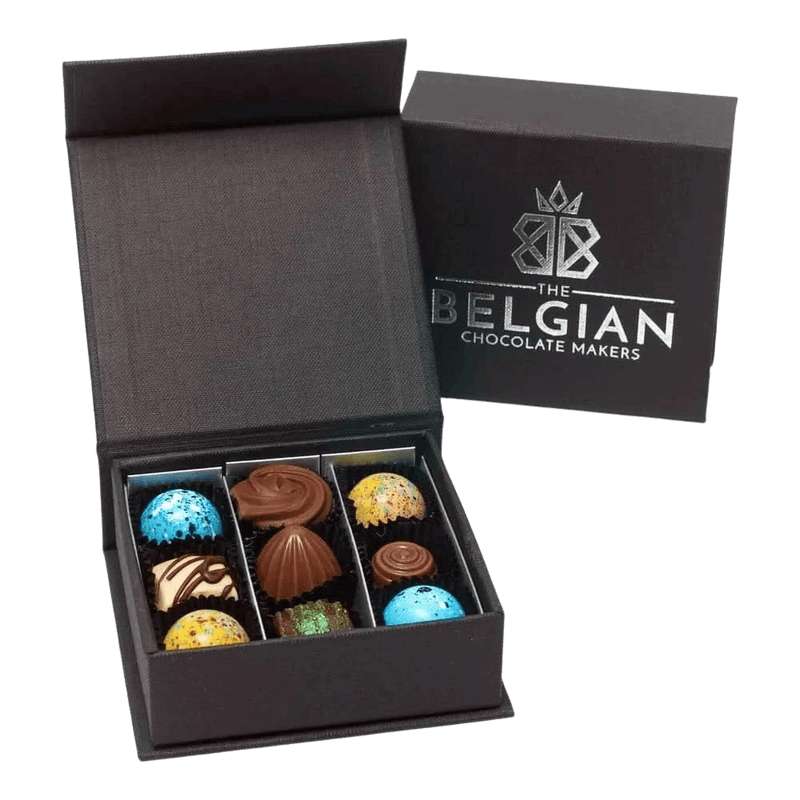 Indulge in our luxury box of 9 Belgian chocolate pralines in mixed flavours, handcrafted in Brussels with ethical cacao. A refined gift or gourmet treat.