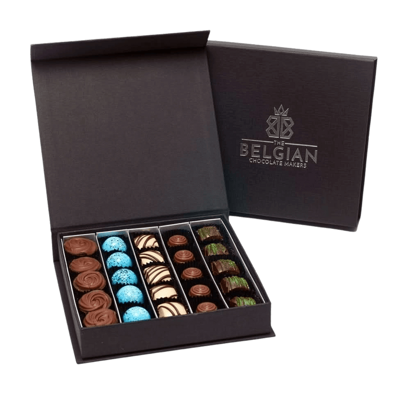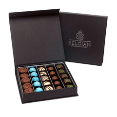 Indulge in our luxury box of 25 Belgian chocolate pralines in mixed flavours, handcrafted in Brussels with ethical cacao. A refined gift or gourmet treat.