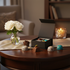 Indulge in our luxury box of 4 Belgian chocolate pralines in mixed flavours, handcrafted in Brussels with ethical cacao. A refined gift or gourmet treat.