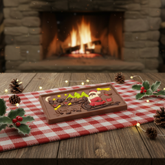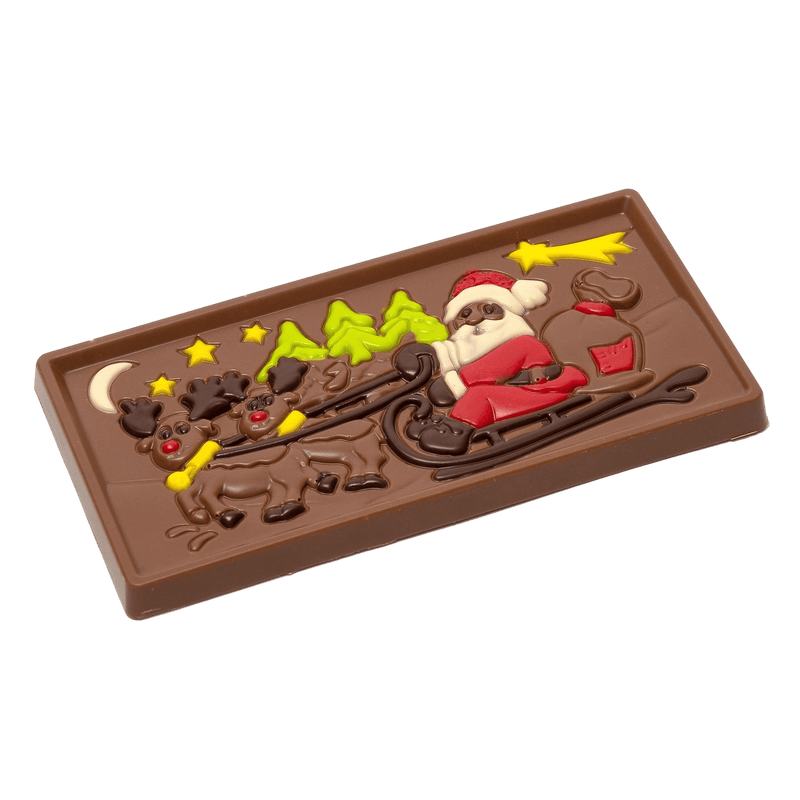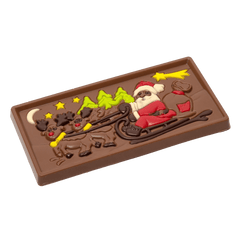 Enjoy the magic of Christmas with our Santa Claus on a sledge milk chocolate bar. Handcrafted in Belgium from pure origin cacao for a festive gourmet treat.