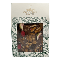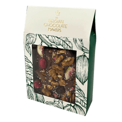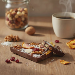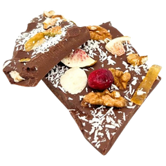 Handcrafted milk chocolate broken bars with fig, lemon, cranberry, walnut, coconut. Made with fine cocoa from Haiti, delivering a smooth, fruity, and nutty gourmet delight.