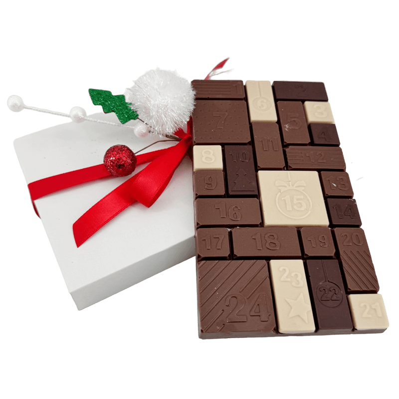 Count down to Christmas with our milk chocolate advent calendar bar 200g, a festive Belgian creation combining creamy milk chocolate and joyful holiday design, perfect for sharing the magic of each day before Christmas.