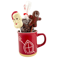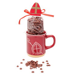 Enjoy our 200g milk chocolate drops in a festive Saint Nicholas mug, handcrafted in Belgium, a charming gift combining creamy cocoa delights and a collectible holiday keepsake.
