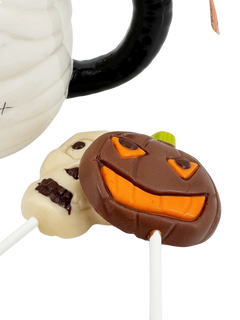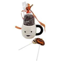 Spooky and delicious! Our mummy-themed cup is filled with creamy Belgian milk chocolate drops and fun lollipops. A perfect Halloween gift for kids and chocolate lovers.