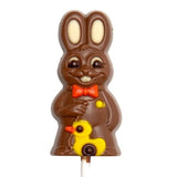 Handcrafted milk chocolate bunny with toy lollipop, a fun and delicious artisanal treat, perfect for Easter celebrations.