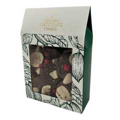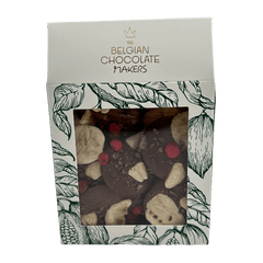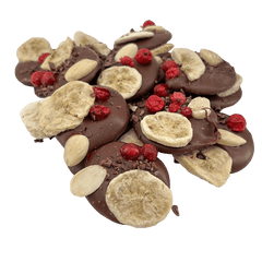 Delicious 150g milk chocolate mendiants topped with banana, almond and pecan pieces, a perfect blend of rich cocoa and crunchy goodness.