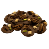 Delicious 150g milk chocolate mendiants topped with pecan, pistachio, raisin and hazelnut pieces, a perfect blend of rich cocoa and crunchy goodness.