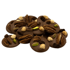 Delicious 150g milk chocolate mendiants topped with pecan, pistachio, raisin and hazelnut chunks, a perfect blend of rich cocoa and crunchy goodness.