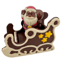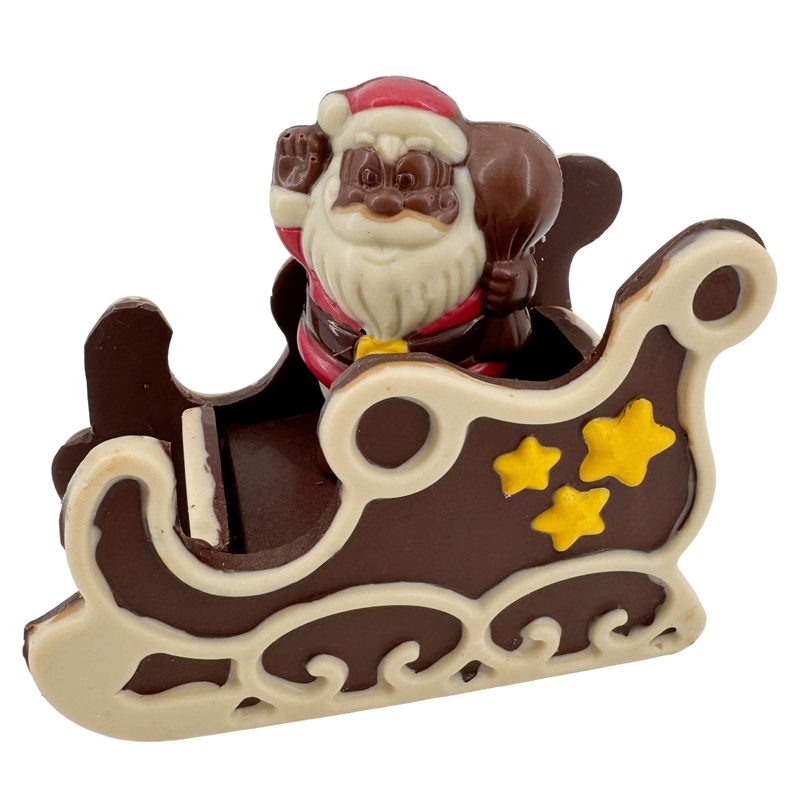 Celebrate Christmas with our handcrafted dark chocolate Santa claus in a sledge (180g). Made in Brussels with sustainable and ethical chocolate and festive detail, a delicious Belgian treat for the holiday season.