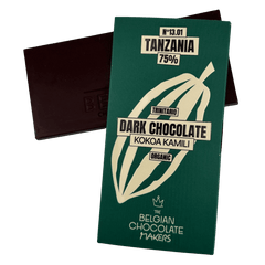 Tanzania Kokoa Kamili 75% dark chocolate, handcrafted in Brussels from single-origin cacao. A vibrant bar with bright citrus notes and refined complexity.