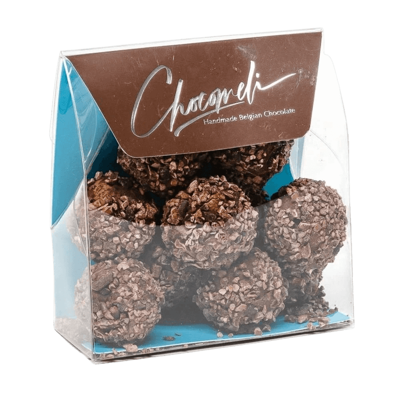 Discover our 140g pouch of Belgian chocolate truffles with cacao nibs. Handcrafted in Brussels, combining smooth cacao with crunchy nibs for an intense gourmet experience.