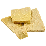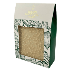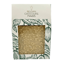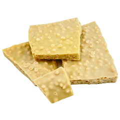 Discover our artisanal white chocolate broken bar with puffed rice, handcrafted for a creamy sweetness and light, crispy crunch in every bite.