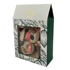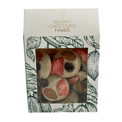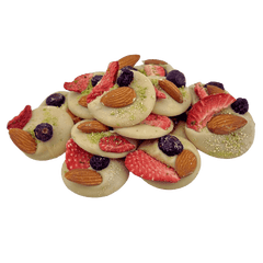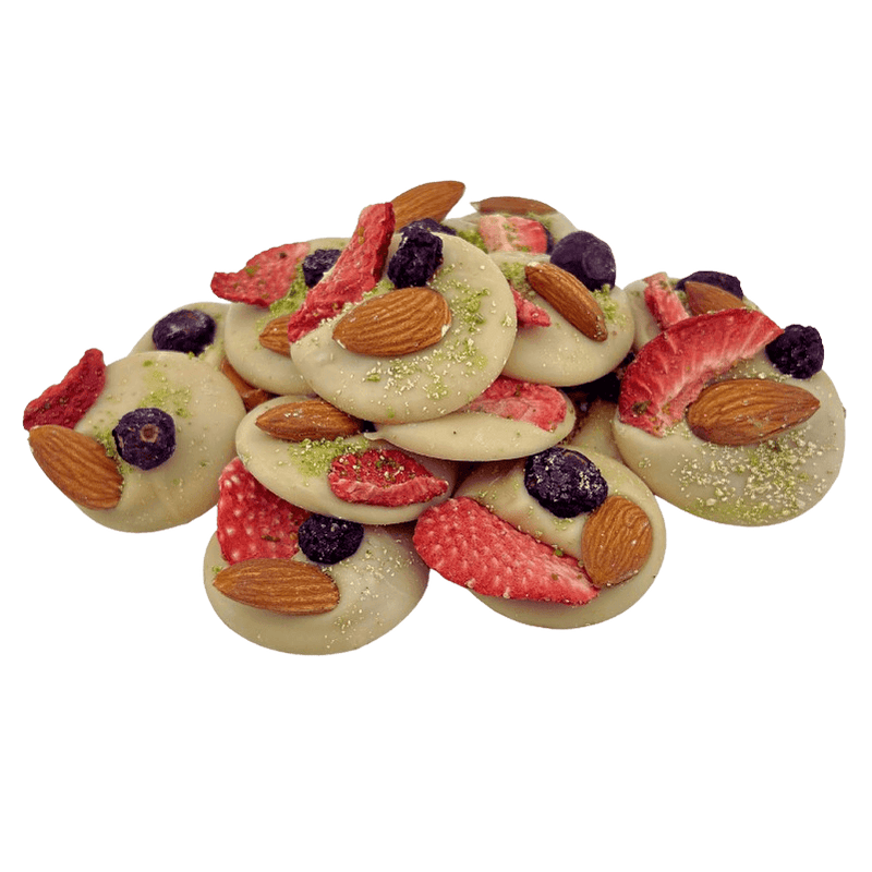 Delicious 150g white chocolate mendiants topped with pistachio, almond, strawberry and blackcurrant pieces, a perfect blend of rich cocoa and crunchy goodness.