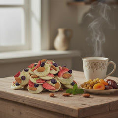 Delicious 150g white chocolate mendiants topped with pistachio, almond, strawberry and blackcurrant chunks, a perfect blend of rich cocoa and crunchy goodness.